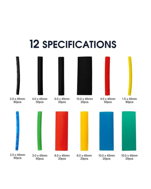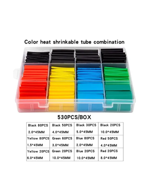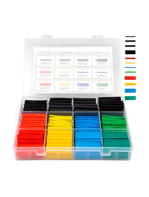 El paquete incluye 530 tubos termoretráctil con 5 colores y 12 tamaños que se adaptan a todo tipo de cables, todos embalados en una caja de plástico para un fácil almacenamiento o transporte: