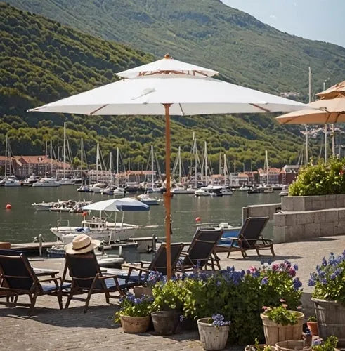 Juego de mesa, sillas y quitasol de estilo combinado.